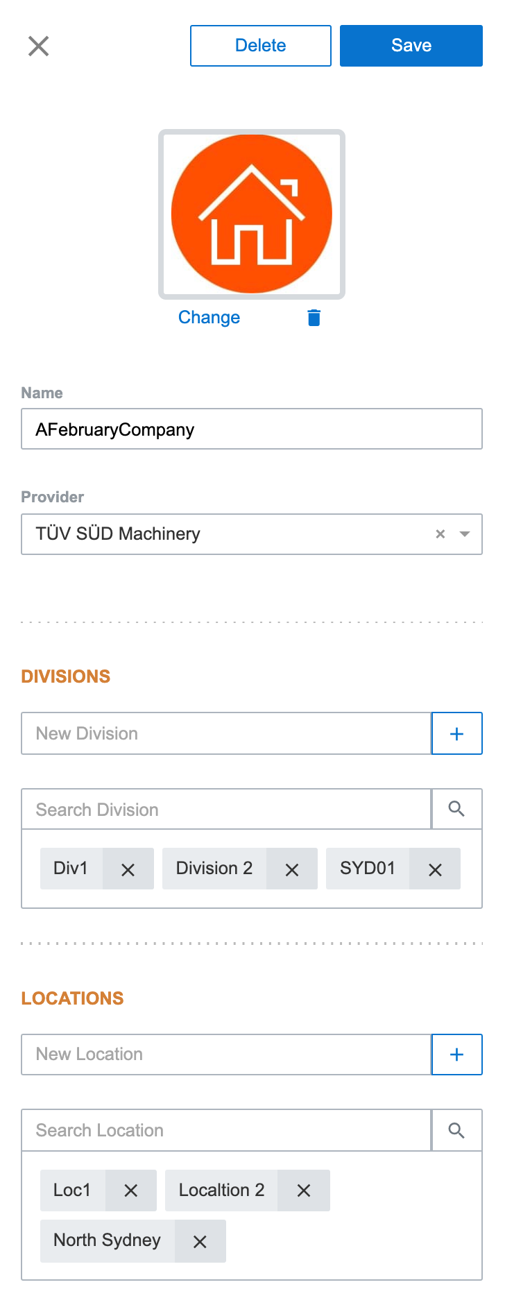 Divisions - divisions defined for this company. Value is then used in Sites definition. Division can be deleted only when it is not used in any Site.