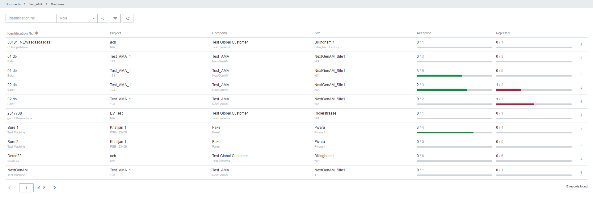The documents list shows you all projects machines and the related documents status where you are listed as project member. The status of documents can be seen on the two right columns “Accepted” and “Rejected”. The grey number within the rows shows how many documents are connected to the project machine and the black number counts how many are “Accepted” or “Rejected” by TÜV SÜD. Goal is to have every document “Accepted” - so especially when TÜV SÜD has “Rejected” a document with reasons, measures need to be taken to get the document “Accepted”.