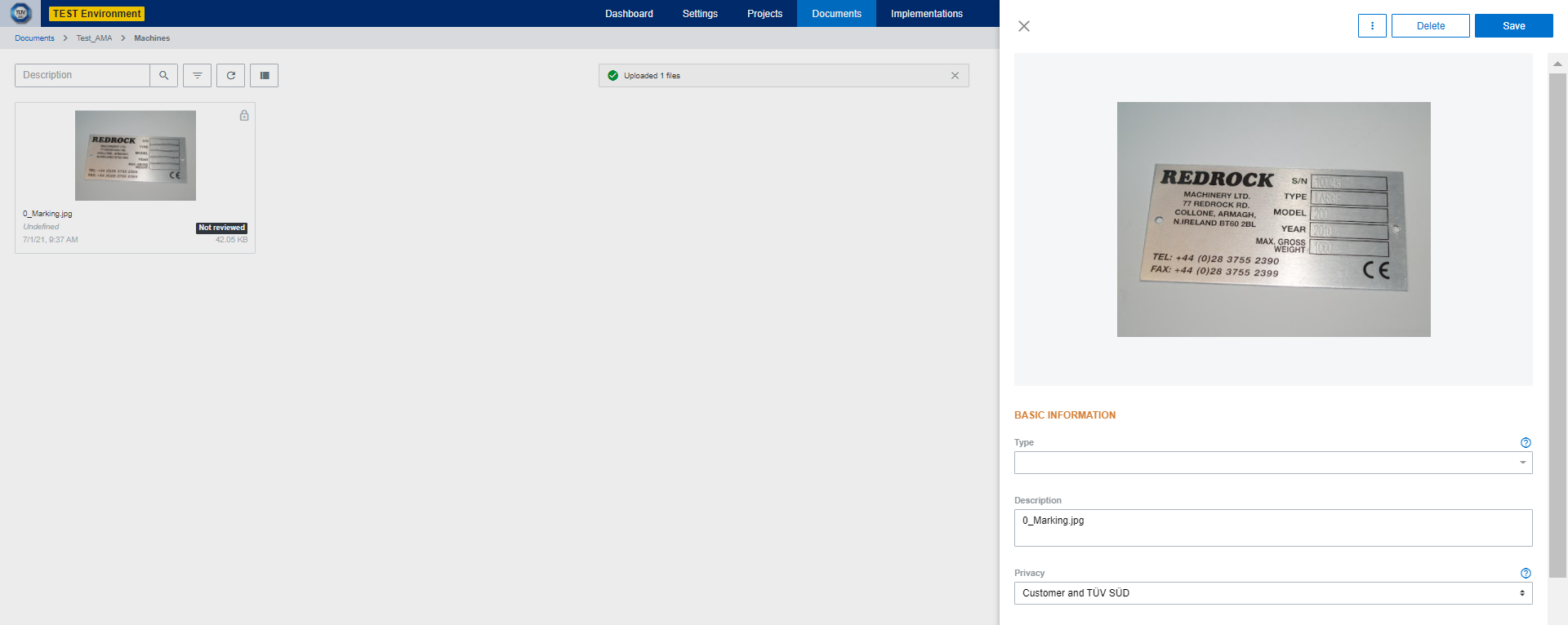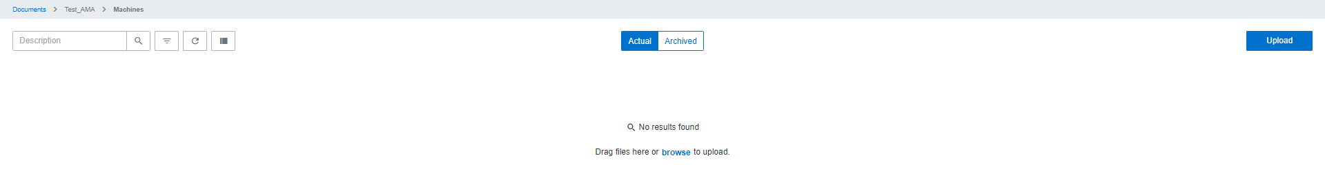 This modal screen is used to add new project machine documents. By clicking on “Upload” you are able to upload one or multiple documents in one go.