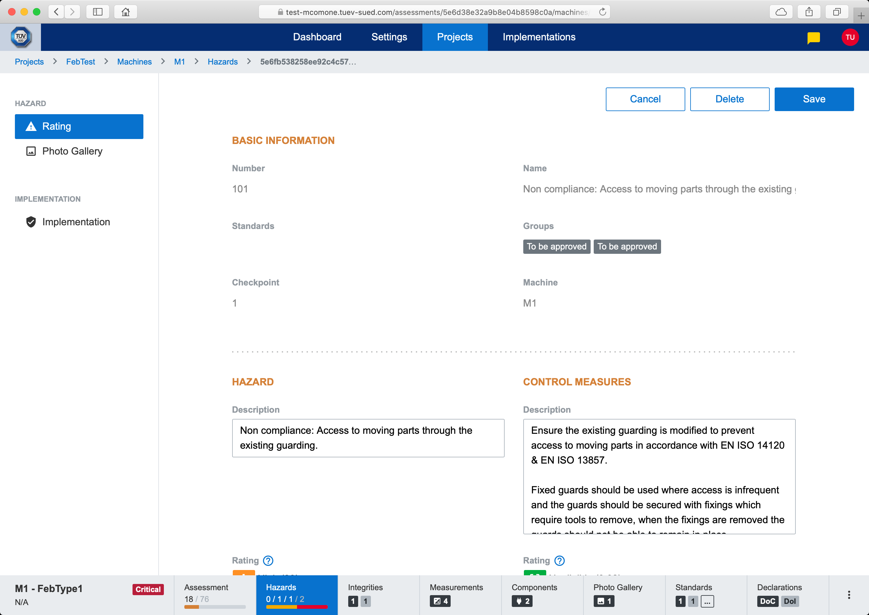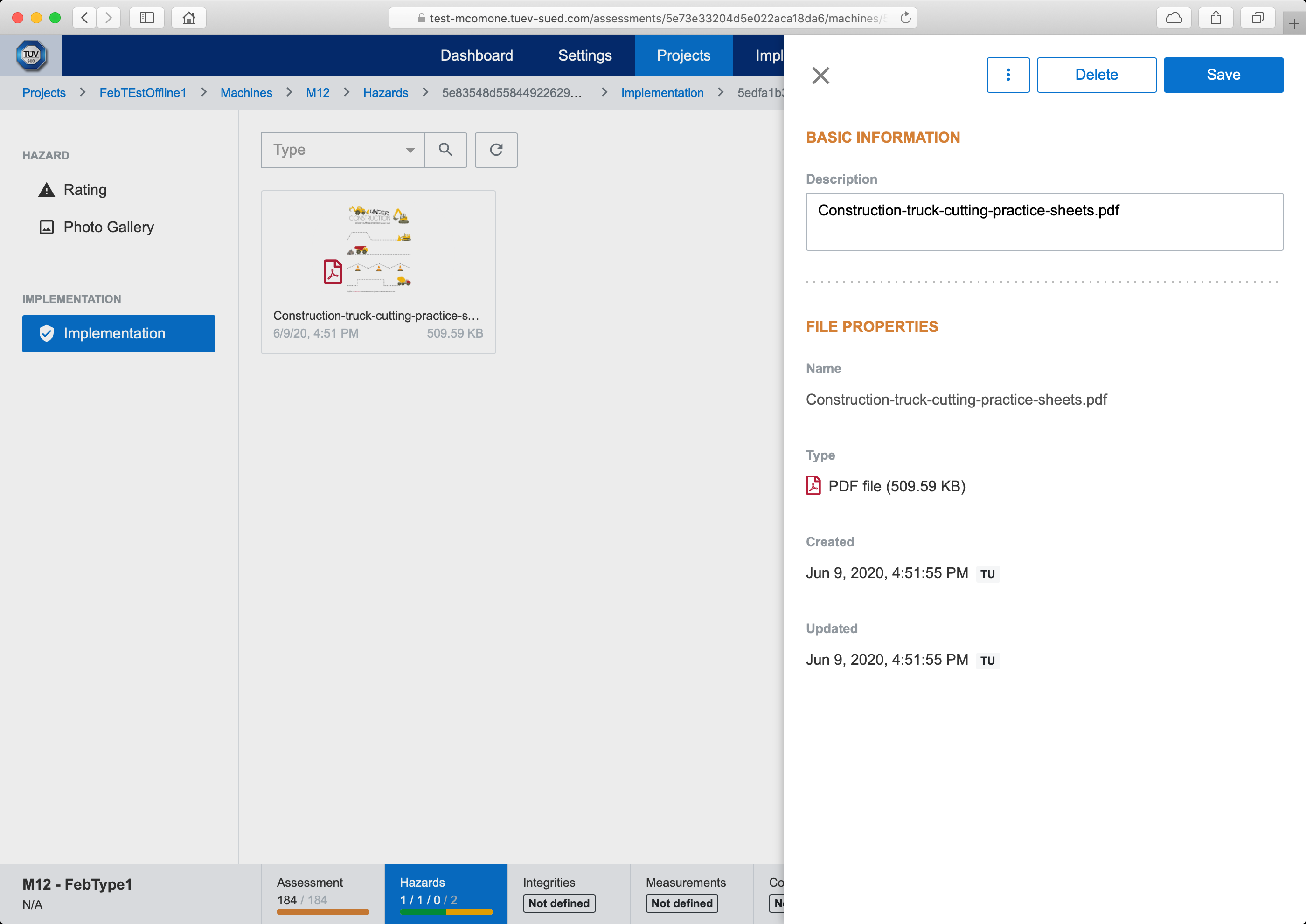 Delete - will delete hazard from project machine assessment and deassociate it from corresponding checkpoint.