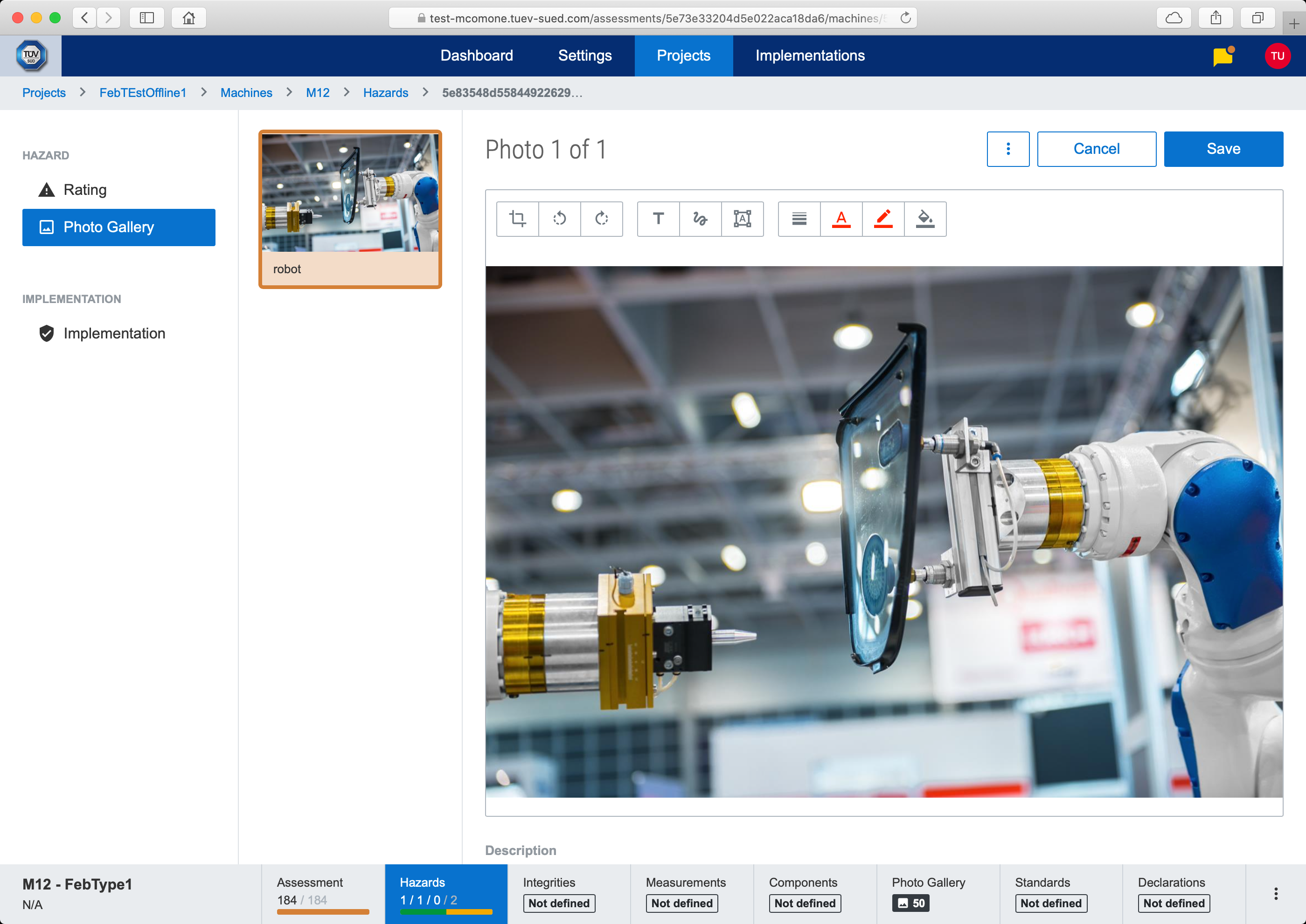 This modal screen is used to edit hazard photo (i.e. photo editing and photo description editing). Basic photo editing capabilities are available: