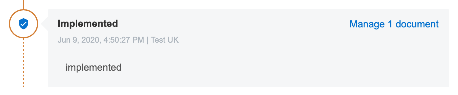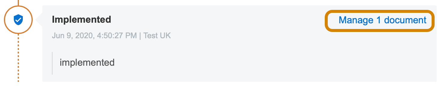 Note: Link Manage documents is available only for user who has created last hazard implementation action in actions timeline because only this user can add, edit or remove attached documents to this hazard implementation action. In order to ensure data consistency and immutability of attached documents, if hazard implementation state is changed (i.e. new hazard implementation action is created), it is not possible to manage attached documents anymore and documents are available for viewing only (via View documents link).