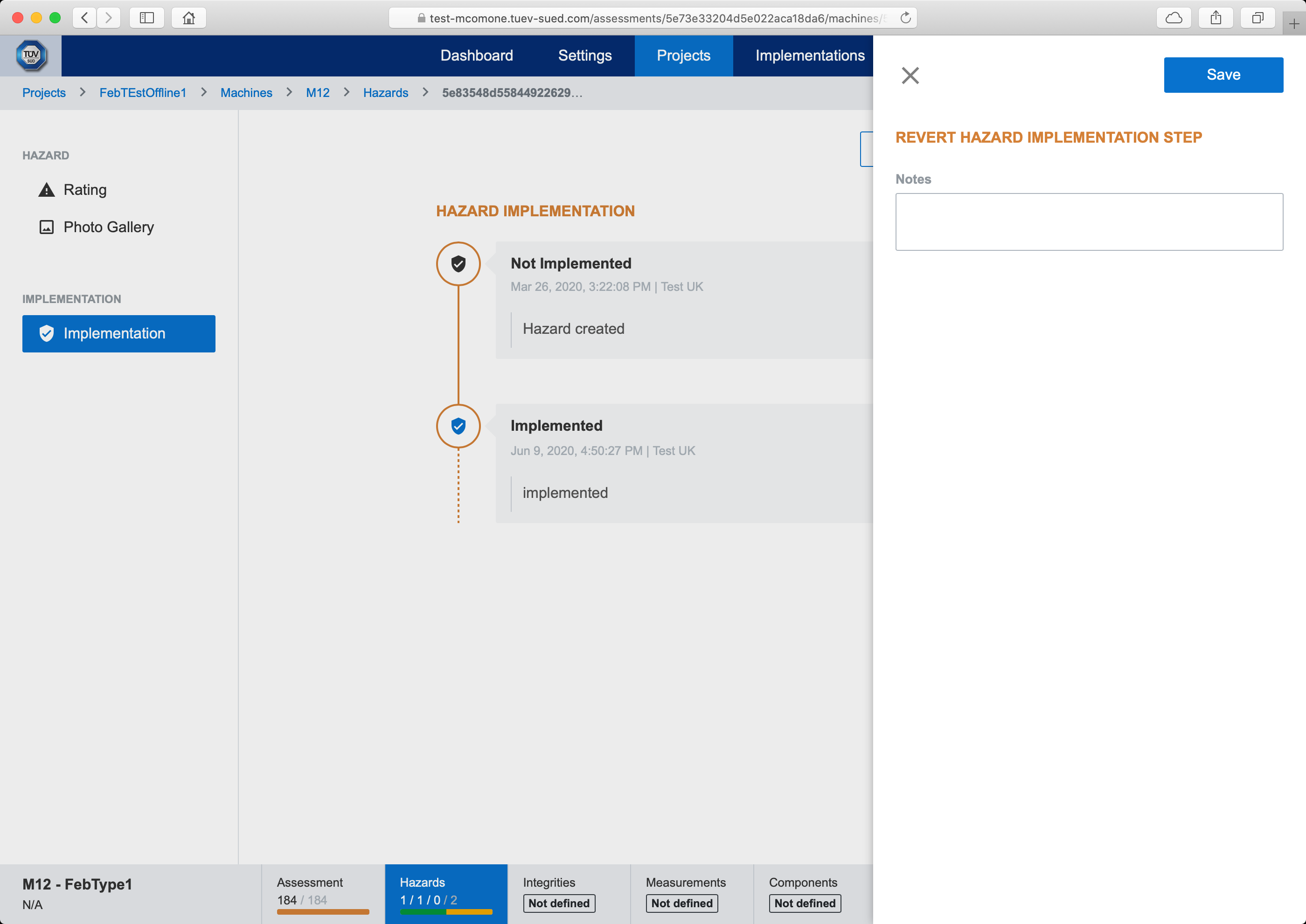 Saving hazard implementation action will create new action in hazard implementation actions timeline and will change hazard implementation to previous state.