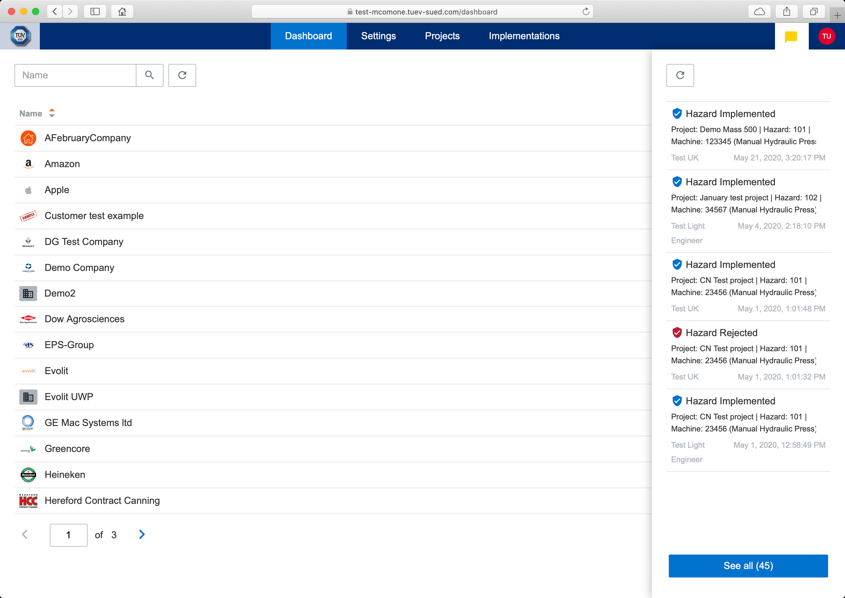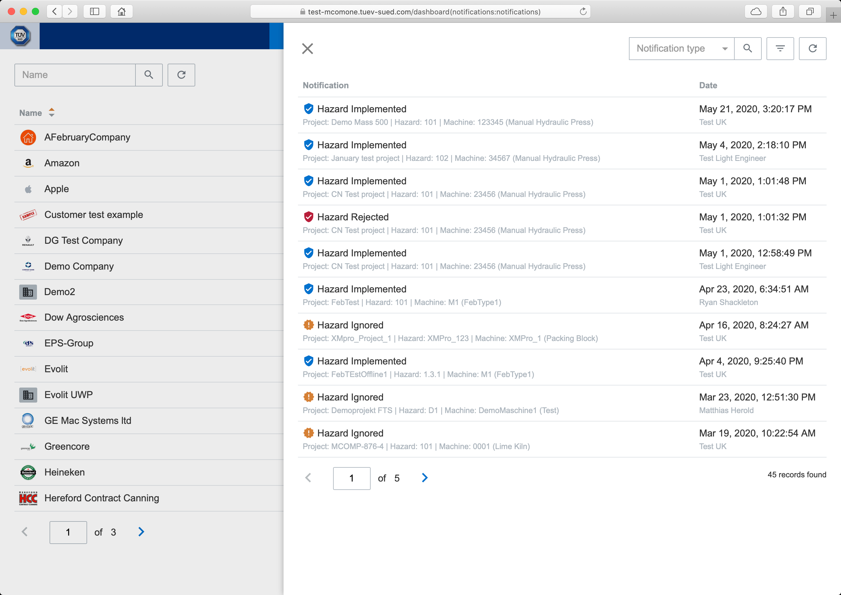 This modal dialog displays max. 5 latest user notifications. Clicking on a notification will redirect directly to corresponding hazard implementation. Pressing button Show all will redirect to user notifications list.